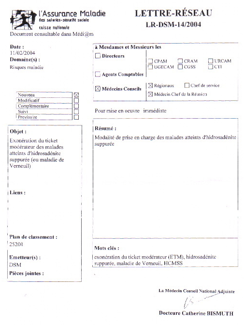 La Maladie de Verneuil peut bénéficier d’une prise en charge ALD (Affection Longue Durée) Hors liste. L’AFRH vous engage à télécharger et imprimer le document émanant de la Caisse Nationale de Sécurité Sociale ci-dessous stipulant ce droit et que vous pourrez ainsi joindre à toute demande de prise en charge.