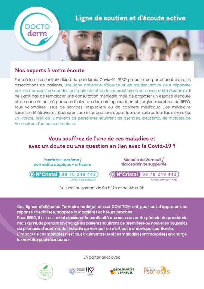 En partenariat avec l’AFRH, Reso-dermatologie met en place une ligne d'écoute active #Covid19 à destination des patients souffrant de psoriasis, d'eczéma, de la maladie de verneuil et d’urticaire - www.doctoderm.fr
